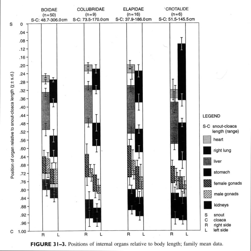 There are charts available for different species that allow us to determine where the different organs are. Due to the elongated body shape, paired organs are generally asymmetrical in their snout-to-cloaca position.